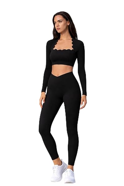 This stylish women’s workout set combines fashion and function for your active lifestyle. The two-piece activewear ensemble features a black long-sleeve crop top with an elegant scalloped square neckline that adds a feminine touch to your gym wardrobe. The wavy detailing creates a flattering silhouette whilst providing comfortable coverage during your workout sessions. Paired with high-waist leggings featuring a distinctive V-shaped waistband, this coordinated outfit offers both support and style. The form-fitting leggings provide excellent flexibility and freedom of movement, making them perfect for yoga, pilates, gym workouts, or casual athleisure wear. The sleek all-black design ensures versatility, allowing you to mix and match with other activewear pieces or wear the set together for a polished, put-together look. The long sleeves offer additional coverage whilst the crop top length creates a modern, trendy aesthetic. Whether you’re flowing through yoga poses, hitting the gym, or running errands, this coordinated workout set keeps you looking chic and feeling confident throughout your day.